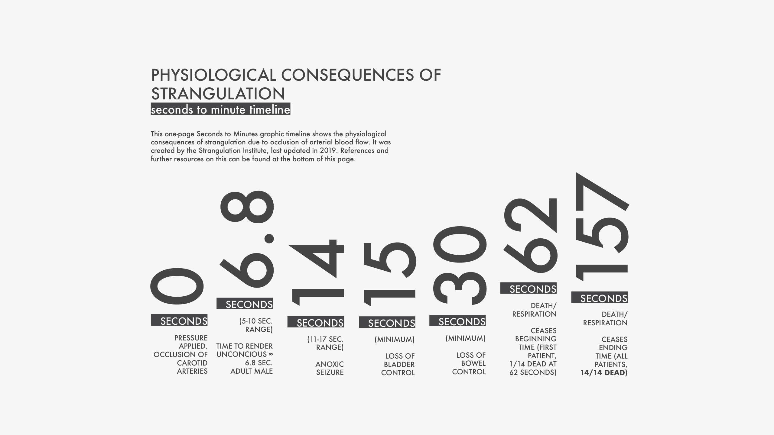 Training Institute on Strangulation Prevention. (2019). Physiological Consequences of Strangulation Seconds To Minute Timeline. Retrieved from https://www.familyjusticecenter.org/wp-content/uploads/2017/12/Physiological-Consequences-of-Strangulation-Seconds-to-Minute-Timeline-v6.18.19.pdf.